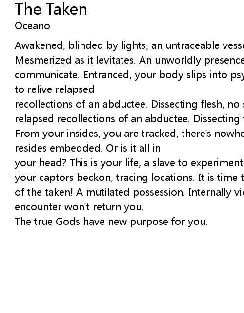 recollections of an abductee. Dissecting flesh, no scars of entry left. Relive relapsed recollections of an abductee. Dissecting flesh, no scars of entry left. From your insides, you are tracked, there's nowhere to hide! A foreign device resides embedded. Or is it all in |