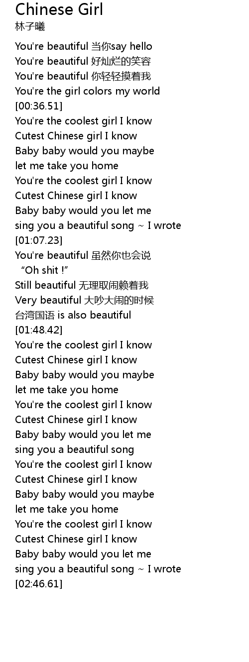 | [00:24.46] | You' re beautiful nǐ qīng qīng mō zhe wǒ |