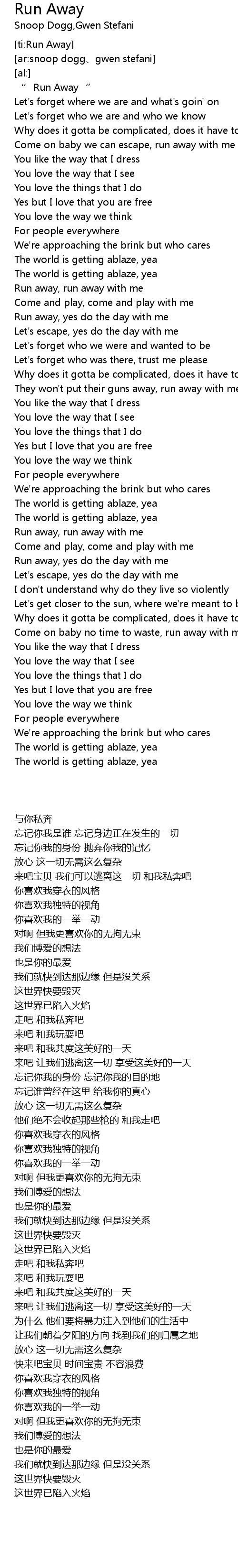| [02:04.17] | They won' t put their guns away, run away with me |