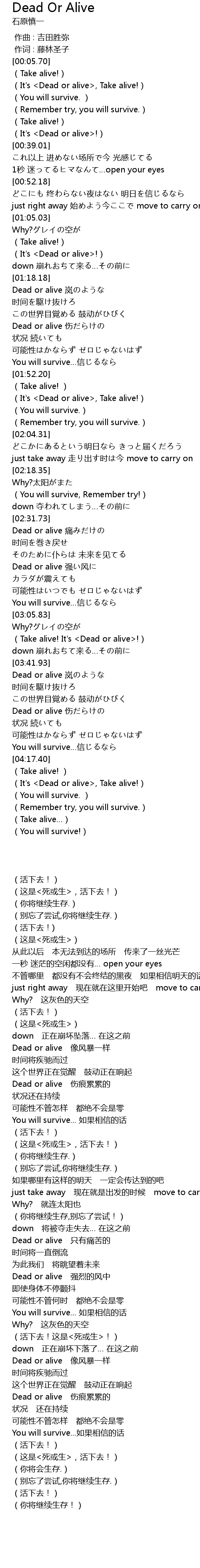 | [01:54.92] | (It's <Dead or alive>, Take alive!) |
