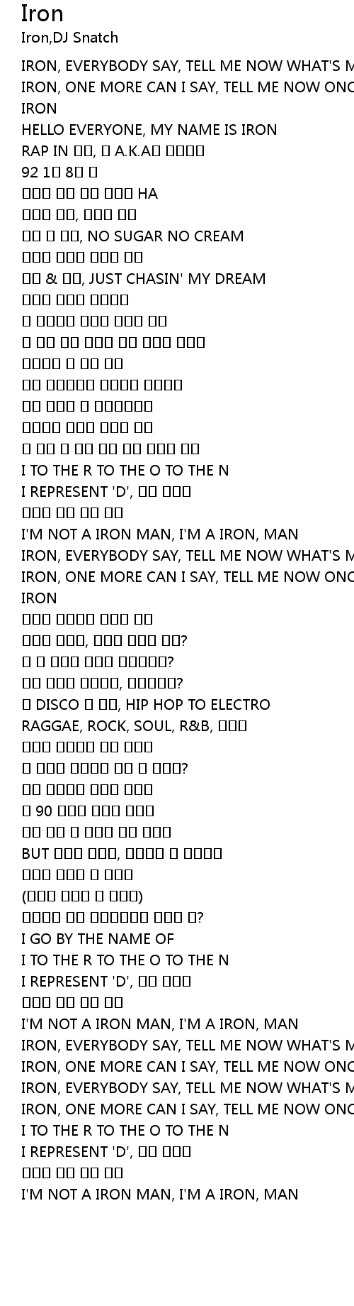 | [00:12.16] | IRON, EVERYBODY SAY, TELL ME NOW WHAT'S MY NAME |