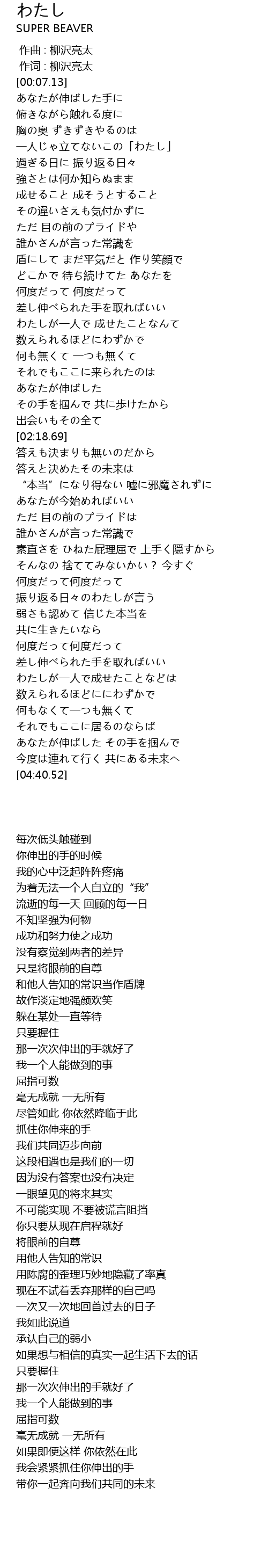 | [00:01.00] | 作词 : 柳沢亮太 |