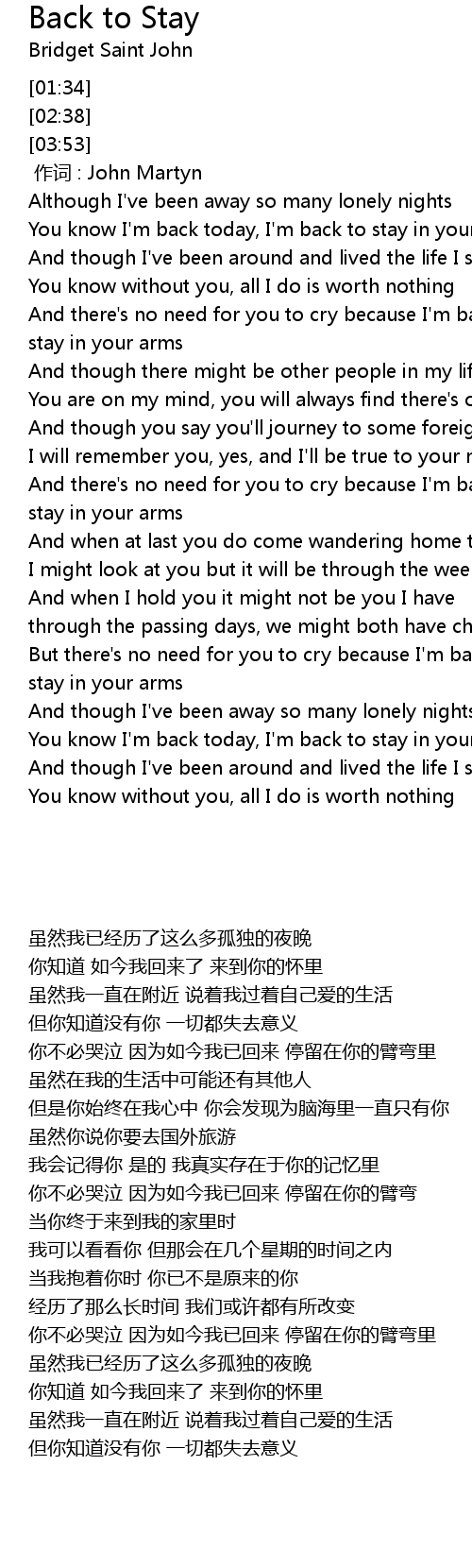 | [03:19.37] | But there' s no need for you to cry because I' m back today I' m back to stay in your arms |