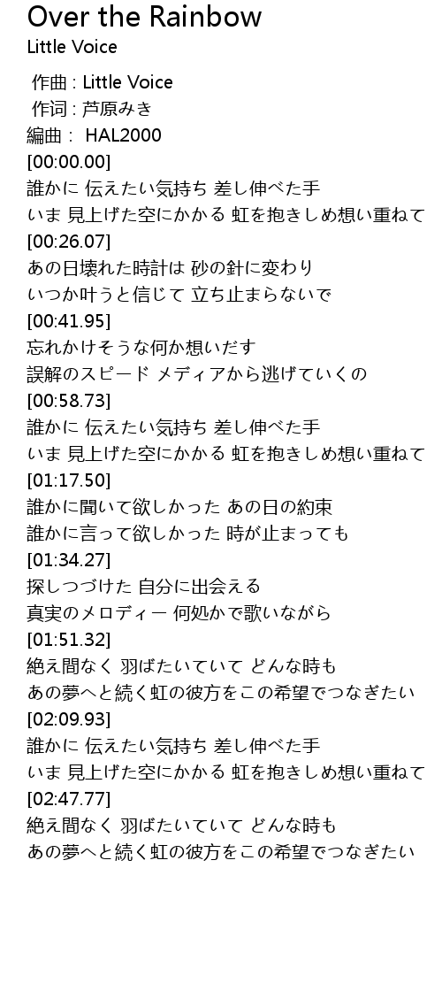 | [02:54.93] | あの夢へと続く虹の彼方をこの希望でつなぎたい |