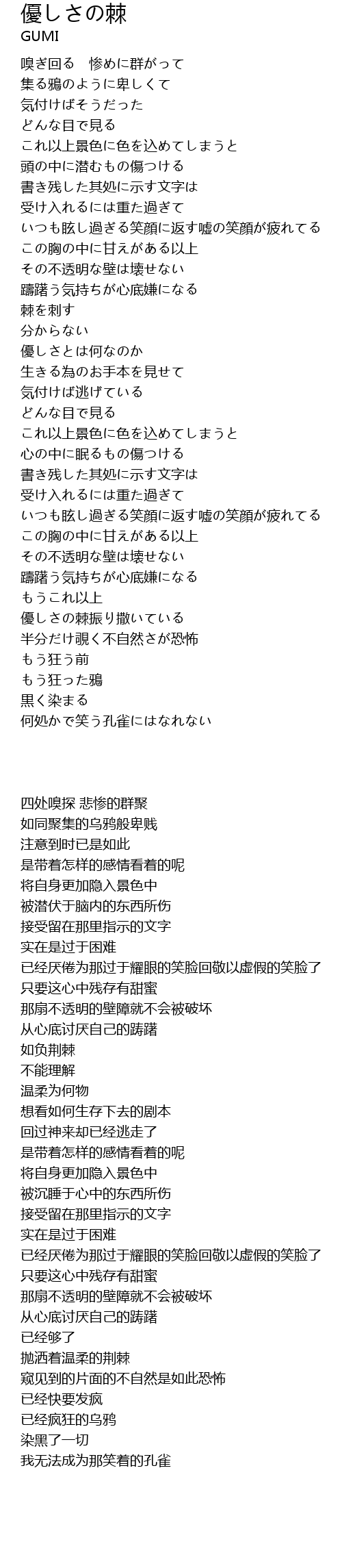 | [02:27.764] | 優しさの棘振り撒いている |