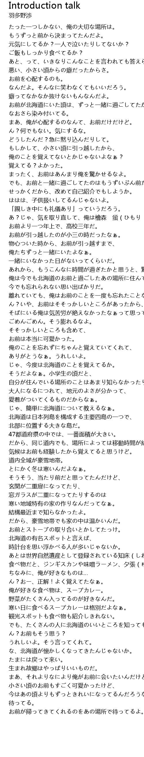 | [00:44.49] | お前が北海道にいた頃は、ずっと一緒に過ごしてたから。 |