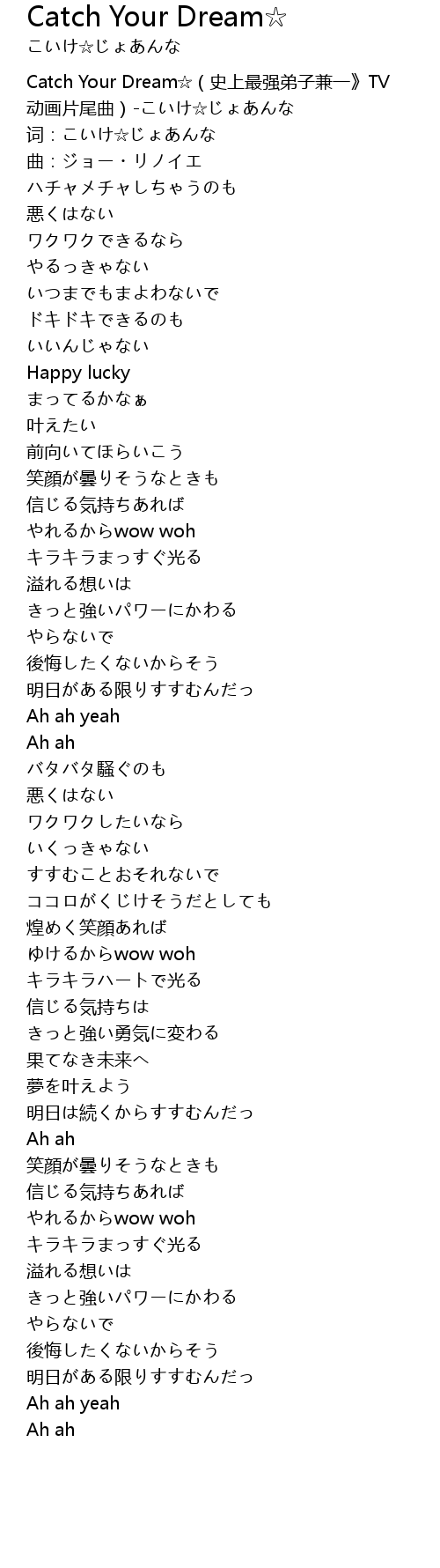 | [00:00.00] | Catch Your Dream☆(史上最强弟子兼一》TV 动画片尾曲)-こいけ☆じょあんな |