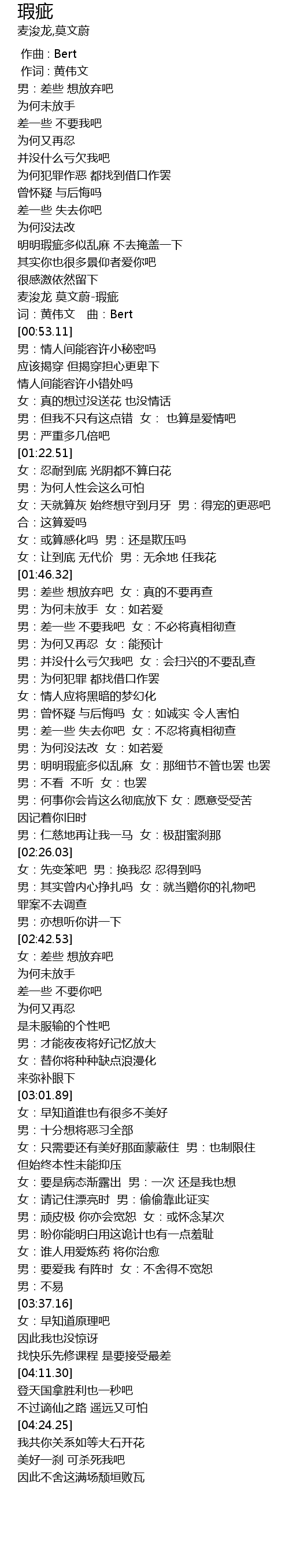 | [00:38.98] | 麦浚龙 莫文蔚-瑕疵 |