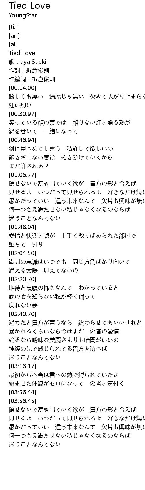 | [03:48.55] | 絡ませた体温がゼロになって 偽者と気付く |