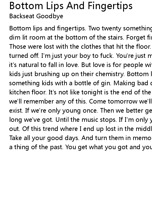Bottom lips and fingertips. Two twenty something kids getting aquainted. In a dim lit room at the bottom of the stairs. Forget first names and old birthdays. Those were lost with the clothes that hit the floor. When the lightswitch got turned off. I'm just your boy to fuck. You're just my girl to touch. Of course it's natural to fall in love. But love is for people with hearts. Not for the kids just brushing up on their chemistry. Bottom lips and fingertips. Two twenty something kids with a bottle of gin. Making bad decisions in a blur on the kitchen floor. It's not like tonight is the end of the world. And It's not like we'll remember any of this. Come tomorrow we'll pretend today didn't even ever exist. If we're only young once. Then we better get up. 'Cause we don't know how long we've got. Until the music stops. If I'm only young once. Then I better get out. Of this trend where I end up lost in the middle of a town I know by heart. Take all your good days. And turn them in memories. Forget all the bad it's just a thing of the past. You get what you got and you got what you give. |