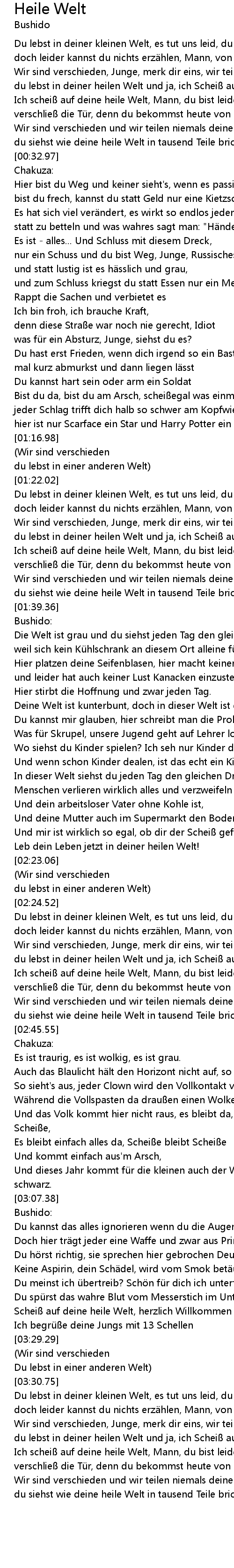 | [03:38.27] | du lebst in deiner heilen Welt und ja, ich Scheiß auf dich! |