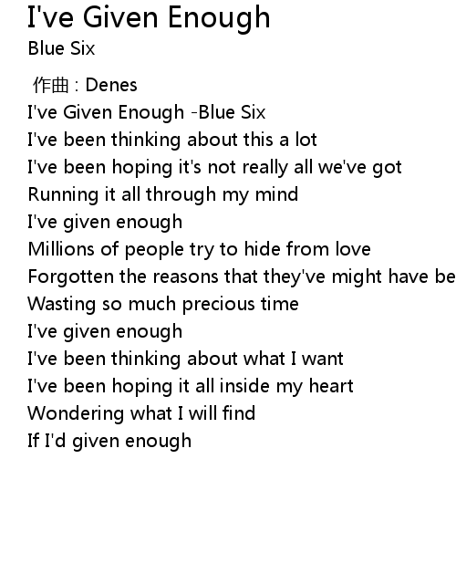 | [00:00.174] | I've Given Enough -Blue Six |