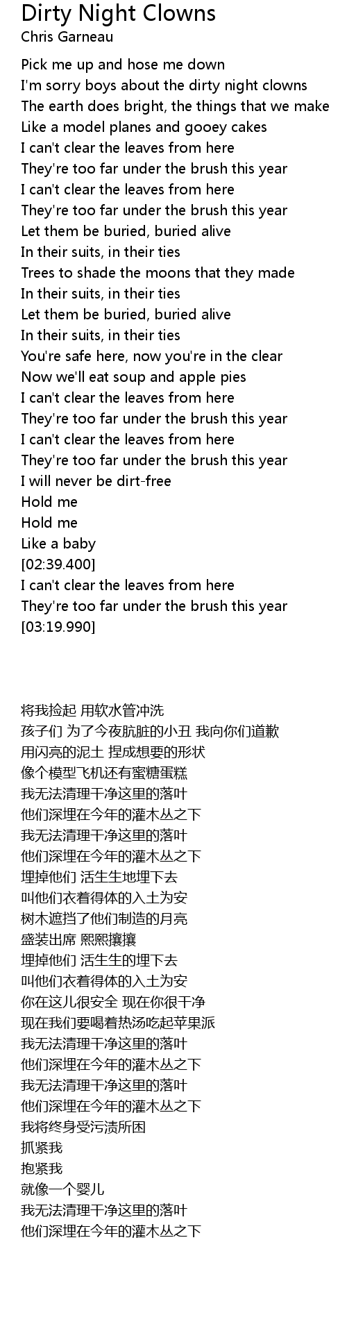 | [00:43.590] | I'm sorry boys about the dirty night clowns |