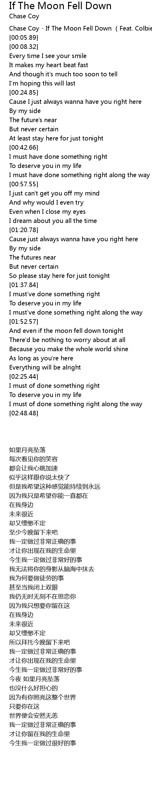 | [00:01.12] | Chase Coy If The Moon Fell Down Feat. Colbie Caillat |