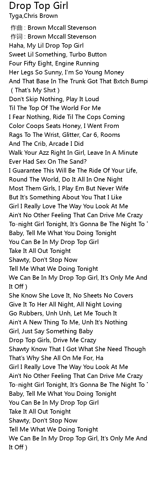 | [02:13.610] | We Can Be In My Drop Top Girl, It' s Only Me And You Tonight Take It Off |