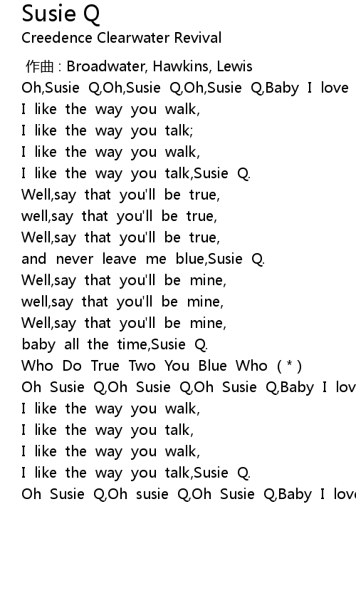 | [03:03.40] | Oh Susie Q, Oh Susie Q, Oh Susie Q, Baby I love you, Susie Q. |