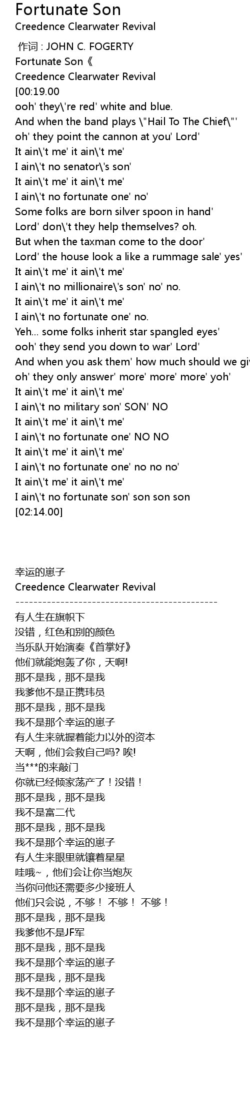| [02:11.00] | I ain\'t no fortunate son' son son son |