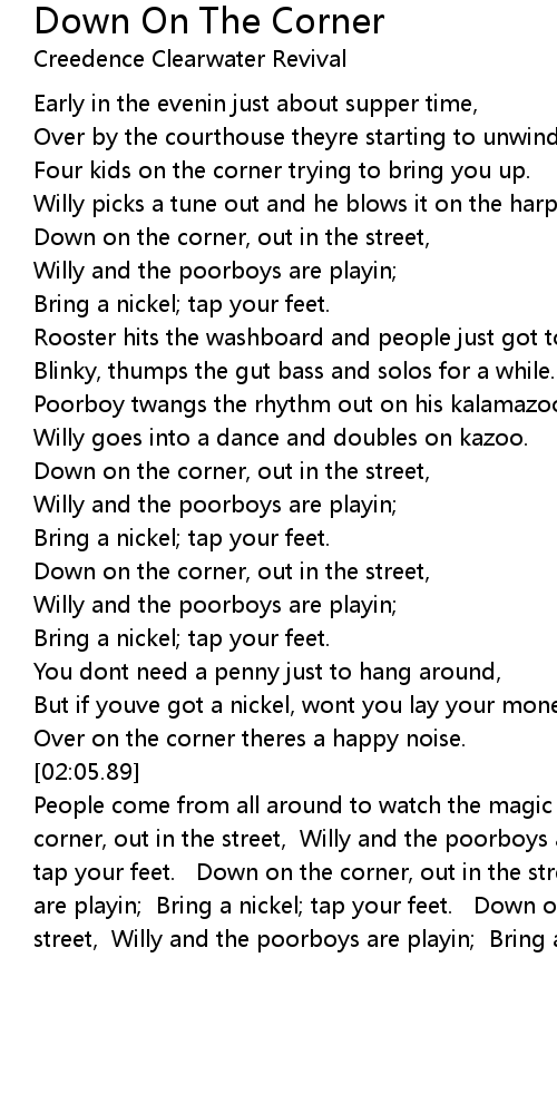 People come from all around to watch the magic boy. Down on the corner, out in the street, Willy and the poorboys are playin; Bring a nickel; tap your feet. Down on the corner, out in the street, Willy and the poorboys are playin; Bring a nickel; tap your feet. Down on the corner, out in the street, Willy and the poorboys are playin; Bring a nickel; tap your feet. |