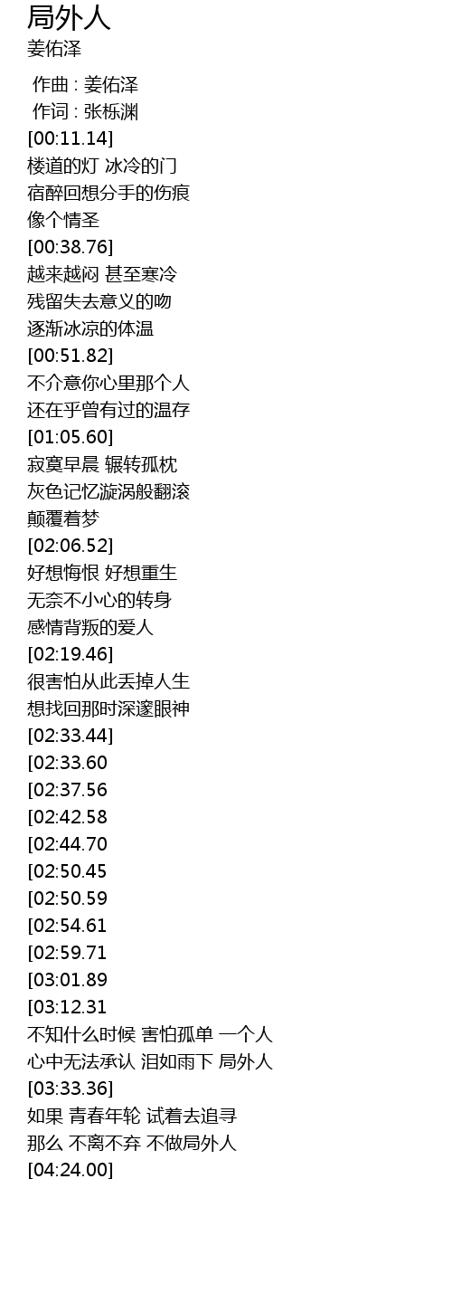 | [03:33.52][02:33.60][01:05.76] | 我是爱情的局外人 |
