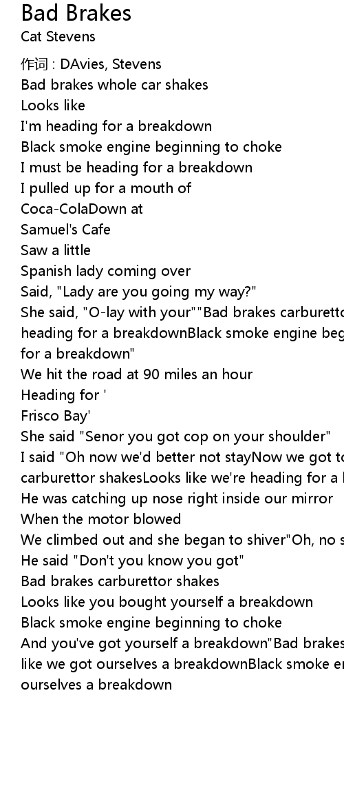 | She said, " Olay with your"" Bad brakes carburettor shakesLooks like you' re heading for a breakdownBlack smoke engine beginning to chokeWe must be heading for a breakdown" | |