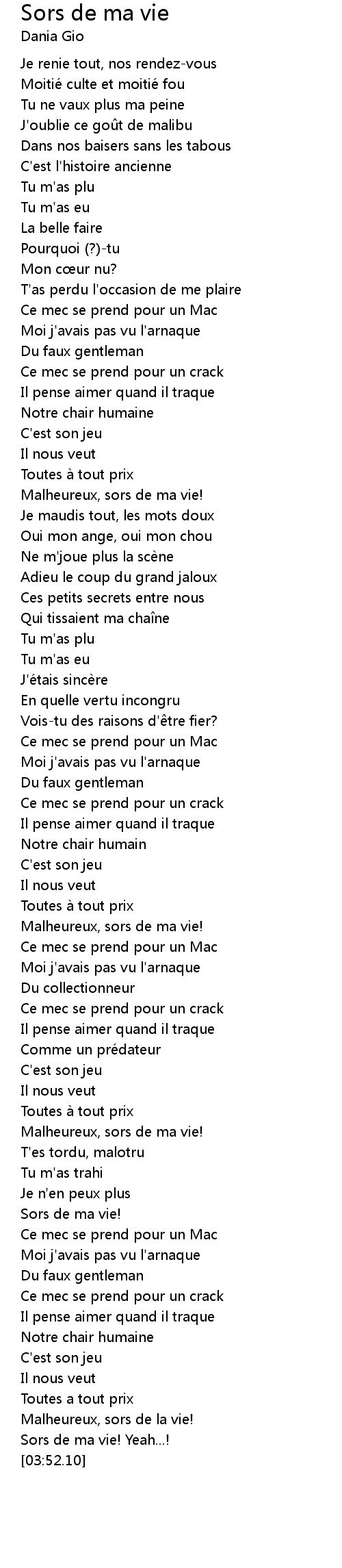 | [02:58.15] | Sors de ma vie! |