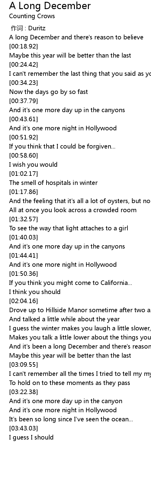 | [02:55.52] | And it's been a long December and there's reason to believe |