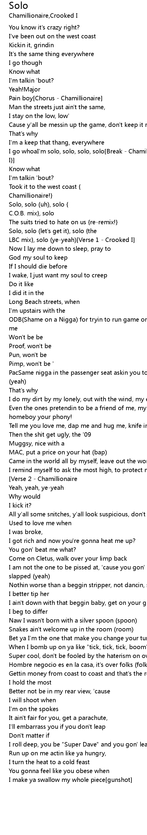 I go whoaI'm solo, solo, solo, solo[Break - Chamillionaire - talking {Crooked I}] |