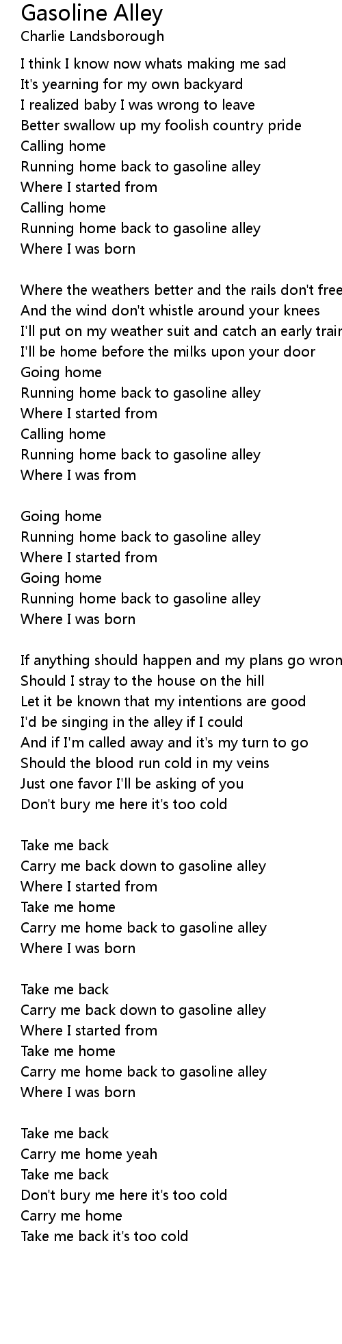 Carry me home back to gasoline alley |