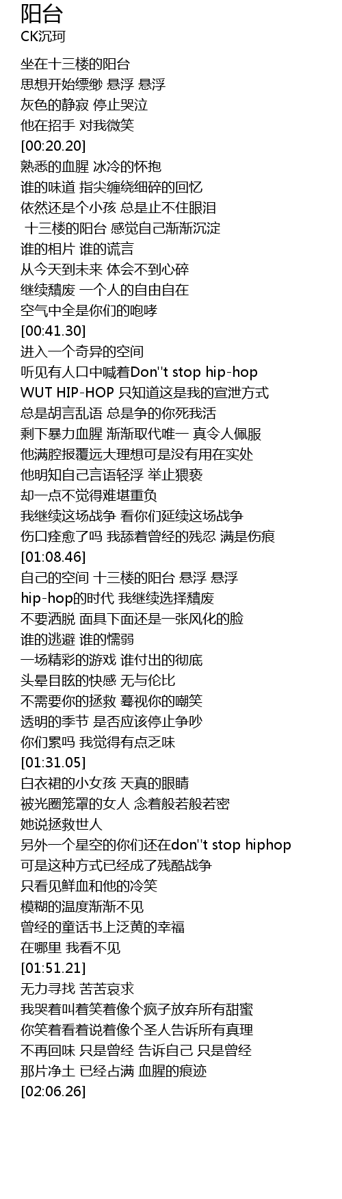 | [00:46.73] | WUT HIP-HOP 只知道这是我的宣泄方式 |