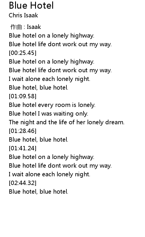 | [00:40.30] | Blue hotel on a lonely highway. |