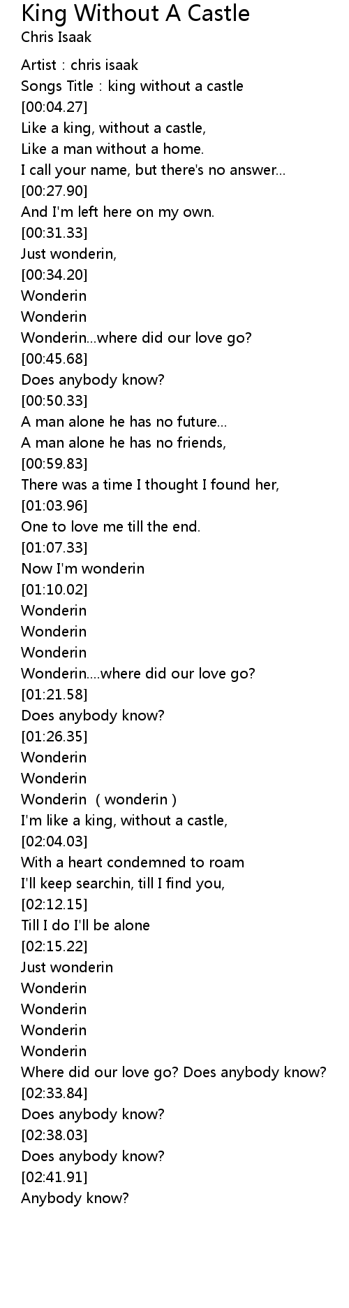 | [00:02.27] | Songs Title:king without a castle |