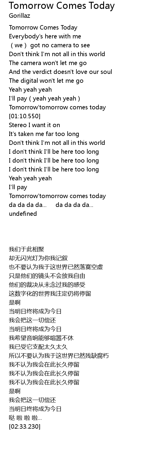 | [02:04.810] | Tomorrow' tomorrow comes today |