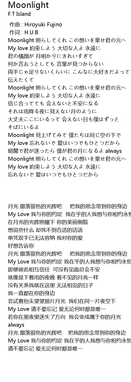 | [00:06.47] | Moonlight 照らしてくれ この想いを乗せ君の元へ |