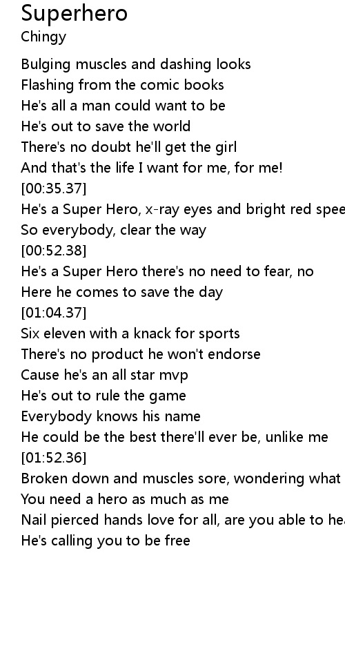 | [00:38.42] | He's a Super Hero, x-ray eyes and bright red speedo |