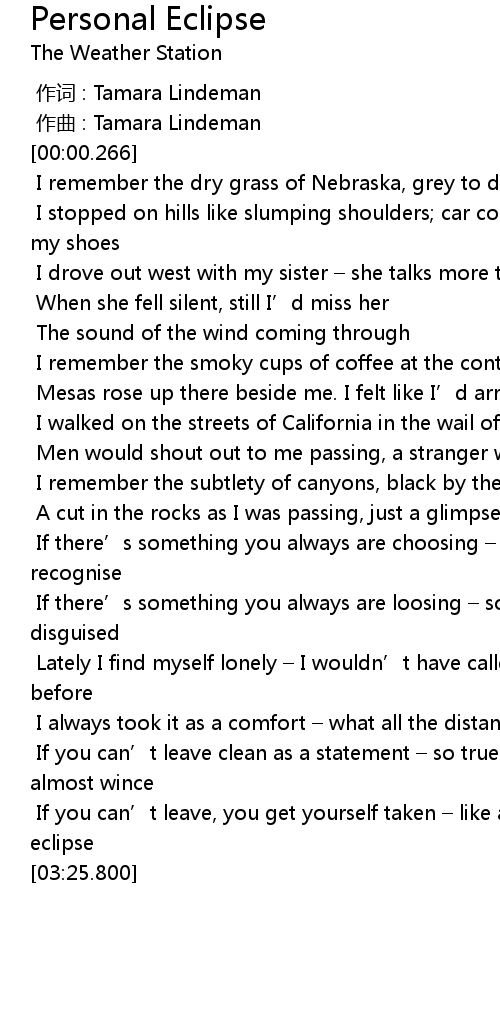 | [03:16.617] | If you can' t leave, you get yourself taken like a personal eclipse |