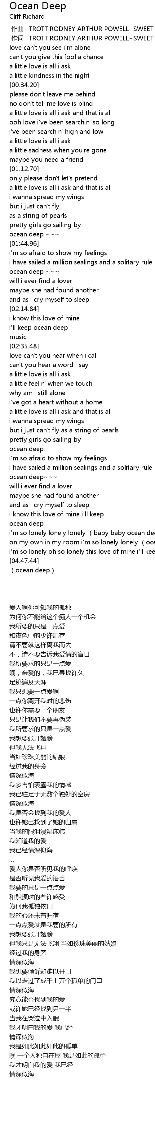 | [04:14.89] | i' m so lonely lonely lonely baby baby ocean deep |