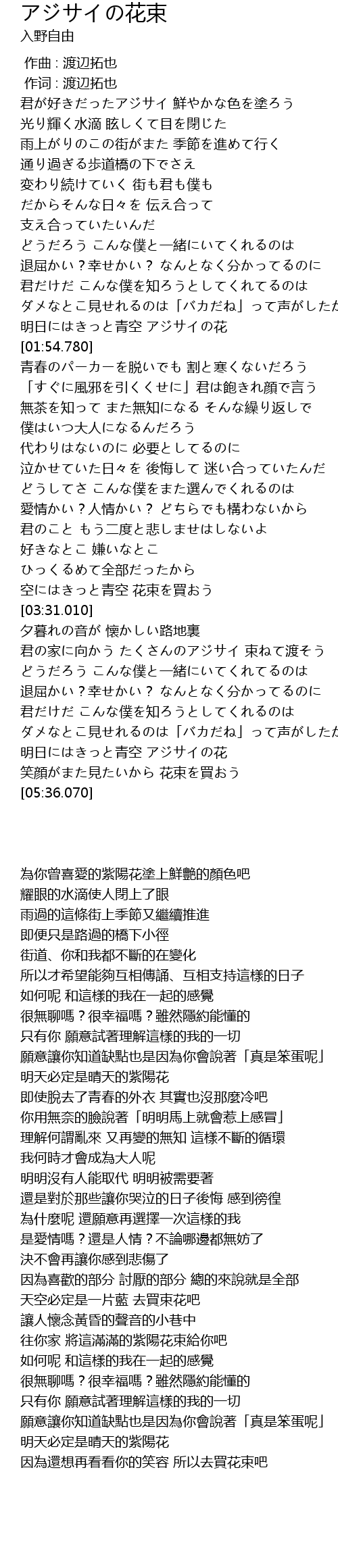 | [03:58.200] | 君の家に向かう たくさんのアジサイ 束ねて渡そう |