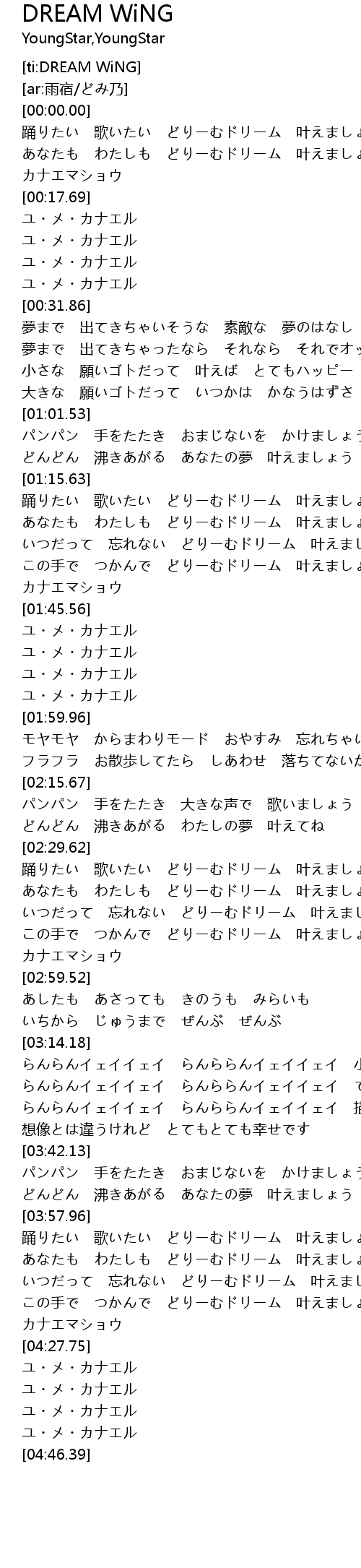 | [03:58.34] | 踊りたい 歌いたい どりーむドリーム 叶えましょう |