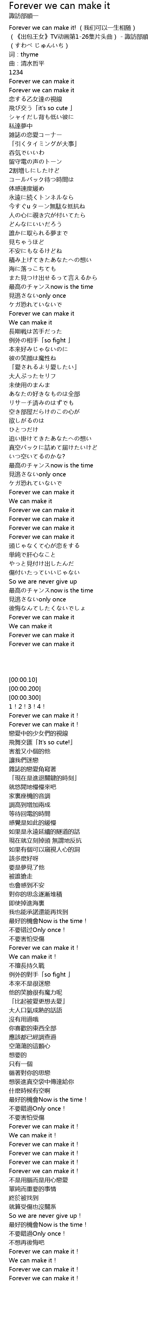 | [00:00.10] | Forever we can make it! (我们可以一生相随) (《出包王女》TV动画第1-26集片头曲) - 諏訪部順一 (すわべ じゅんいち) |