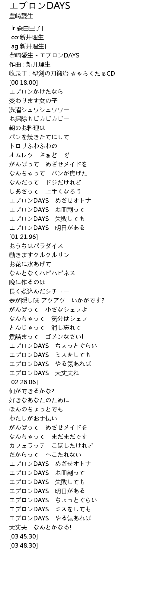 | [03:30.11] | エプロンDAYS ちょっとぐらい |