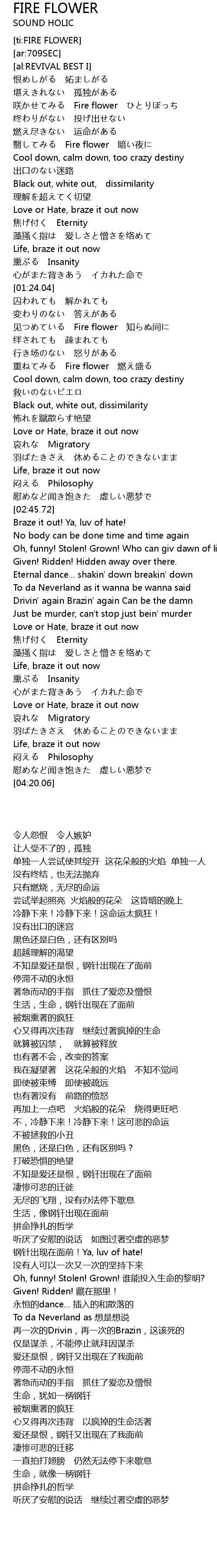 | [01:51.71] | 重ねてみる Fire flower 燃え盛る |