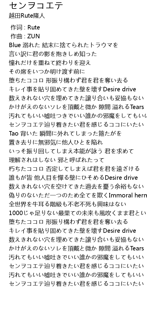 | [04:16.61] | センヲコエテ辿り着きたい君を感じるココにいたい |