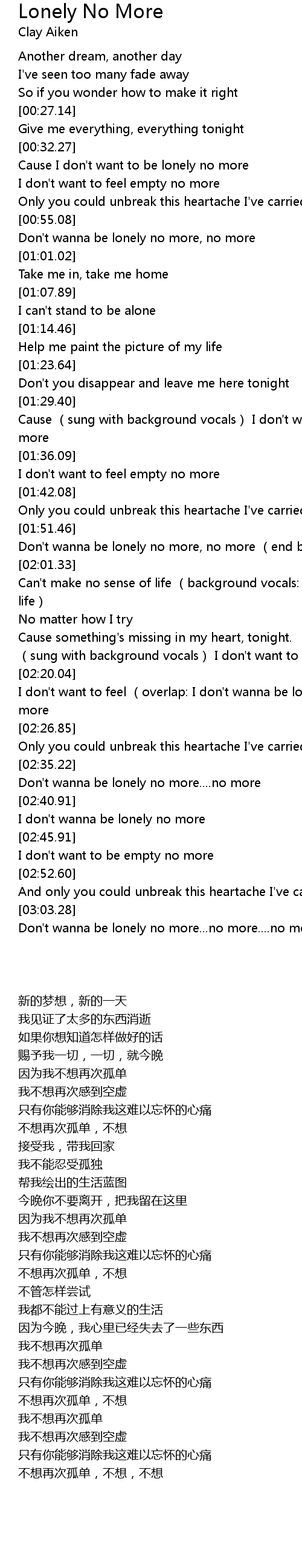 | [00:34.27] | Cause I don't want to be lonely no more |