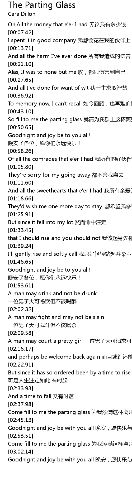 | [02:54.10] | Come fill to me the parting glass 为我添满这杯离别酒 |