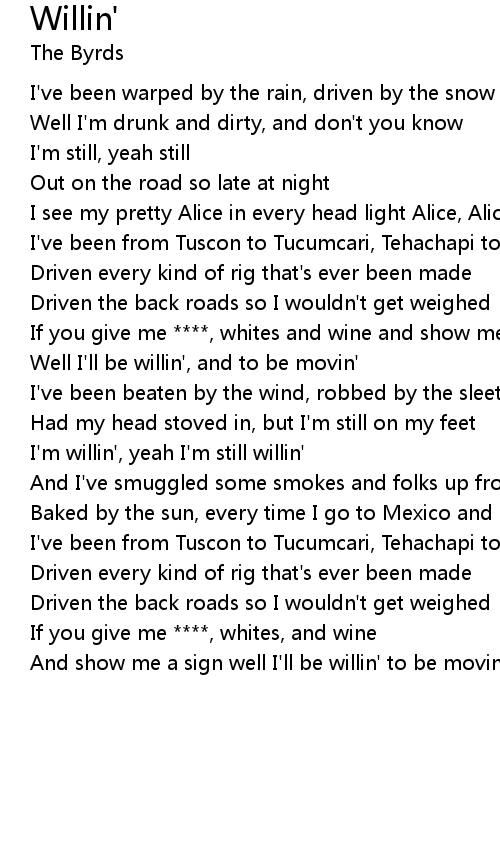 | Well I'll be willin', and to be movin' | |