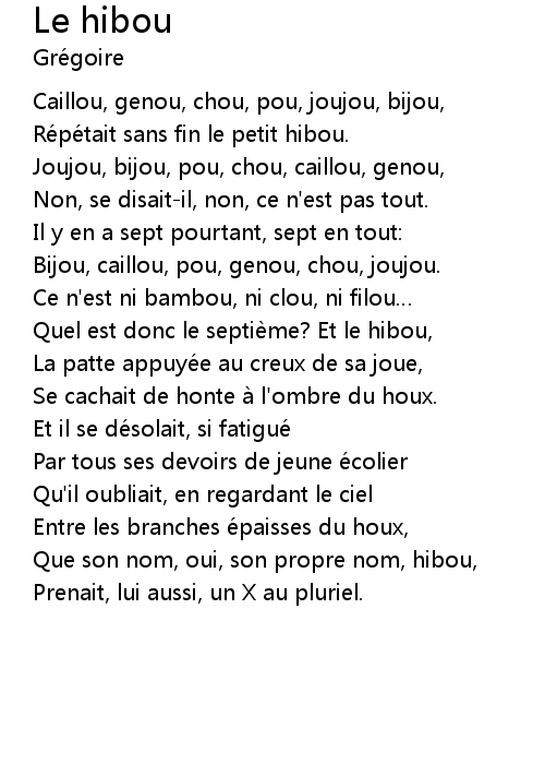 | [00:32.09] | Quel est donc le septième? Et le hibou, |