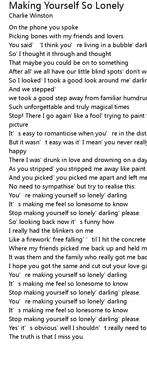 | [03:43.53] | Stop making yourself so lonely' darling' please. |