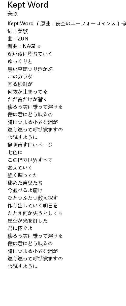| [00:00.278] | Kept Word (原曲:夜空のユーフォーロマンス)-美歌 |
