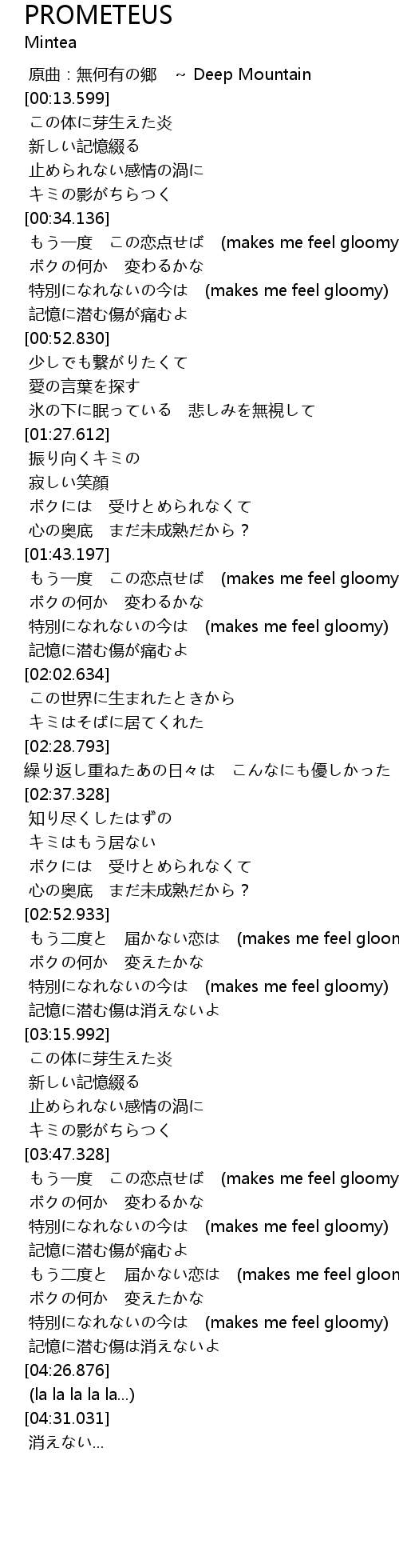 | [04:07.255] | もう二度と 届かない恋は (makes me feel gloomy) |