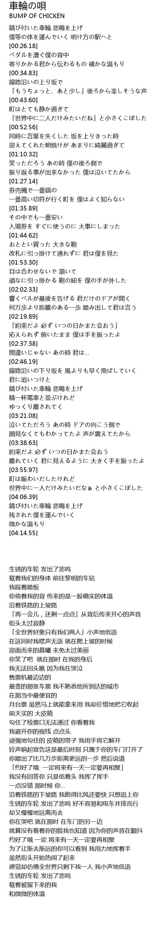 | [00:17.45] | 錆び付いた車輪 悲鳴を上げ |